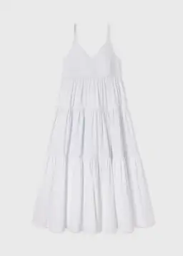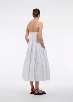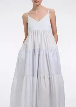 A lightweight v-neck dress in GOTS organic cotton with an empire seam bodice, tiered a-line silhouette, adjustable straps, and side pockets.