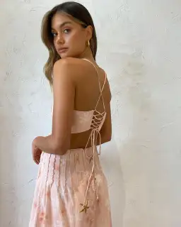 Elevating the Evelyn dress further with its subtle waist cut outs that continue to the exposed back and intricate lace up bodice, the Evelyn will have you floating through life's special occasions with effortless charm and endless grace