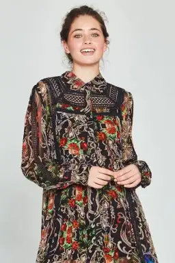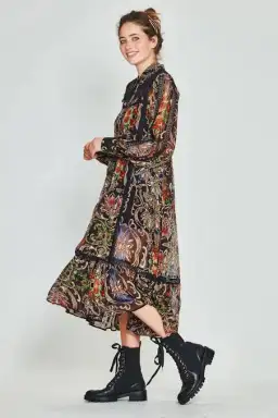 Designed in the ‘Moonflower’ viscose yoryu, an intricately patterned print that stands out against a black background. The ‘State of Lace’ tiered maxi dress features stunning lace inserts, a classic collar and button through front. This is an effortlessly elegant everyday to evening dress.