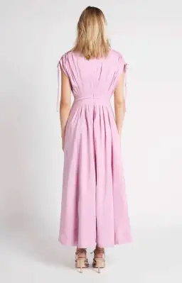The Cosmos Midi Dress features a deep v neckline with drawcord shoulder details for a structured yet soft impression. Deep pleating, side seam pockets and a voluminous skirt complete this contemporary romantic silhouette.