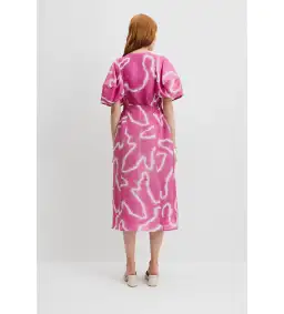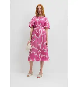 Made using a linen-silk blend with a subtle slub finish, this relaxed A-line midi dress offers a modern take on classic style. It has a short balloon sleeve, belted waistline, topstitch detailing and a concealed placket with tonal buttons.