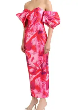 "The Courtney Dress designed in our signature Sõleada print features a sweetheart neckline complimented with dramatic off the shoulder sleeves. The fitted bodice flows into a cinched waist accentuated by asymmetrical boning channels that adorn the body. Fully lined and fastened at the centre back with an invisible zipper, the Courtney Dress is the essence of beauty and sophistication."