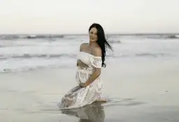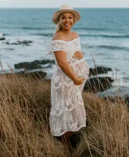 This gorgeous ethereal off-the-shoulder ivory lace dress is our all-time favourite dress for baby showers, maternity photos and more. It can be worn as a non-maternity dress, so you can wear it post-partum and for years after your pregnancy.