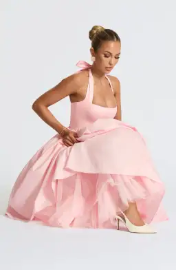 Elegant Babyboo “Cressida” midi dress in soft blush tone. Designed with a square halter neckline and a full skirt gathered at the waist. Featuring princess seams, lace-up back, and internal tulle for extra volume. Perfect for race days, parties, or special events. Professionally dry-cleaned and in excellent condition.