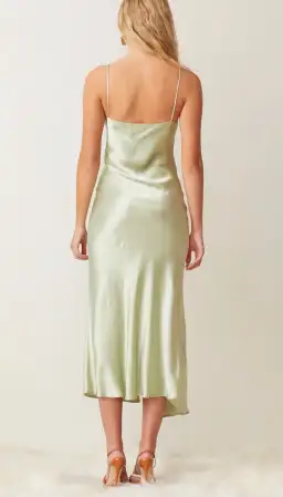 Elevate your after-dusk repertoire with the Crest Midi Dress by Australian label Bec + Bridge. Spun from sumptuous satin in a light green hue, the bias-cut silhouette is defined by its alluring V-neckline and statement thigh split.