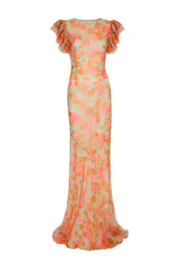 A new and exclusive De La Vali gown, The Bougainvillea Ruffle Maxi Dress is THE dress for the approaching summer wedding season and beyond. In a striking, fluid bias cut silhouette with elegant fishtail hemline and voluminous ruffle sleeve.