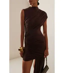 The Ravenna Mini Dress in Chocolate by De La Vali is a beautifully draping mini dress with an asymmetrical hemline. This sleeveless silhouette is the perfect event style and is designed to flatter and fit the wearer.