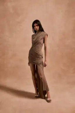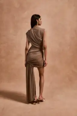 The Ravenna Mini Dress in Taupe by De La Vali is a beautifully draping mini dress with an asymmetrical hemline. This sleeveless silhouette is the perfect event style and is designed to flatter and fit the wearer. Pair yours with gold or silver jewellery and a pump.