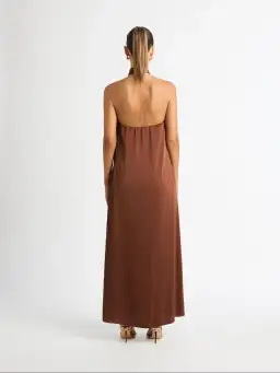 Flattering silhouettes and silky satin finishes make up the Destiny Maxi Dress. Showcasing a relaxed fit, a halter cowl neckline, corded belt and side seam pockets.
