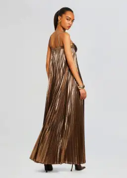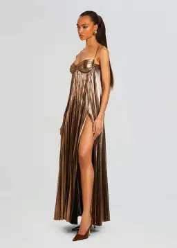 Indulge in timeless elegance with our sophisticated and elegant Diana Dress. Designed to exude class and sophistication, this gown is the epitome of refined style. This gown showcases a beautifully structured cupped bra top that enhances and flatters your silhouette with grace and poise. The flowing hem adds an air of effortless glamour, making it the perfect choice for any special occasion. Shown here in Bronze.