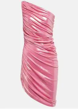 The metallic "Candy Pink" Diana mini dress has an asymmetric, one-shoulder neckline with soft gathers throughout the form-fitting silhouette.