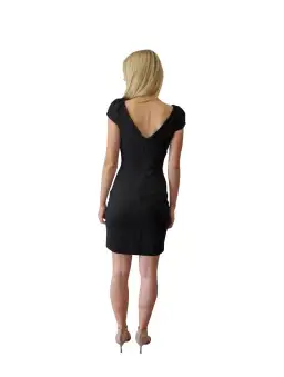 This wide-neck jersey dress features seam details at the bodice. Hidden zip at deep V back. Ruched shoulders. Cap cold sleeves.