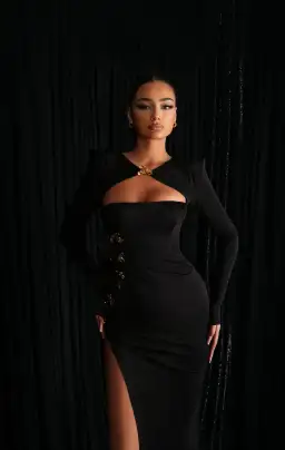 The fitted waist sculpts the figure, while intricate gold embellishments cascade artfully along one side, adding a touch of opulence. A daring high slit offers both drama and movement, perfect for an evening of sophistication.