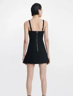 Mini dress with flap pockets at bust and v-wire neckline. Cut from a compact organic cotton stretch twill with boning integrated through bodice. Oversized hook and eye hardware along gusseted side seams for adjustable styling. Detachable and adjustable wide elastic shoulder straps