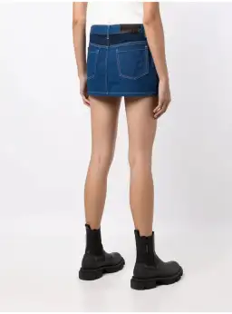 Low rise mini length skirt cut in denim. Featuring eyelet tie front closure and detailed with tonal contrast side and yoke panels. Four pocket styling and signature brushed hardware. Finished with topstitched flat felled seams.