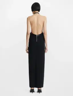 Full length backless halter dress cut in a dry, slinky viscose jersey that drapes effortlessly over the body. Featuring an interwoven premium vachetta leather harness adjustable at neck with mushroom pins. Detailed with delicate barball chain straps at neck and suspended at back waist.