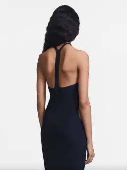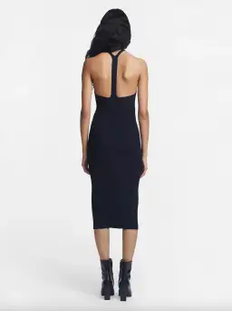 Sleeveless halter neck midi dress featuring a racerback & striking cutouts at waist. Straps at neck & waist are fastened with an e-hook hardware. Cut from a two-tone ribbed lustrate stretch knit for a body skimming silhouette.
