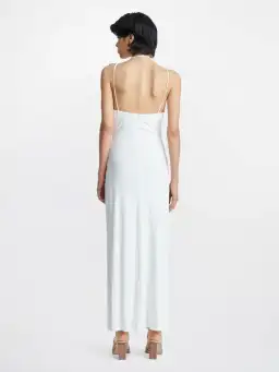 Sleeveless full length dress cut from a slinky viscose jersey for a close fit with soft drape over the body. Featuring gathering along signature barball hardware and cut outs at hips. Split spaghetti strap detail with halter self-tie straps.