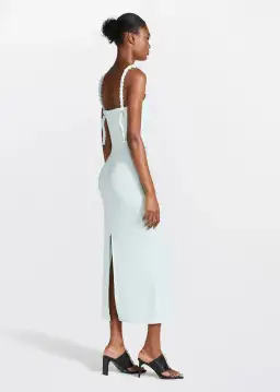 Sleeveless mid-length dress with twisted cord shoulder straps in a lightweight crepe jersey. Cowl neckline and integrated corset with boning. Silver-tone branded eyelets, invisible zip and hem split at back. Fabrication has stretch and drapes effortlessly over the body for a flattering slim silhouette.