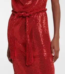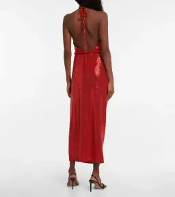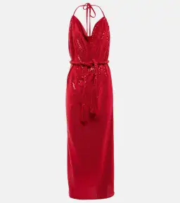 Make a glamorous statement at your next event in this midi dress from Dodo Bar Or. It's cut from an all-over sequin-embellished fabric with halterneck ties, a cowl neckline, and cinches at the waist with a twisted belt.