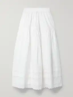 DÔEN Sebastiane broderie anglaise-trimmed organic cotton-poplin midi skirt. DÔEN's pieces often have vintage influences - this 'Sebastiane' skirt is inspired by an Edwardian-era bridal trousseau. Cut from organic white cotton-poplin, it has a tiered silhouette that's finely pintucked and traced with pretty broderie anglaise.