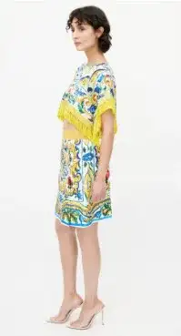 Dolce & Gabbana yellow silk top featuring a multicolour Majolica print throughout, round neckline, fringe trim, and snap closure. Matching skirt features an elasticized scalloped waist, raffia buttons at front, slits at hem, and zip closure at back. Skirt is lined.