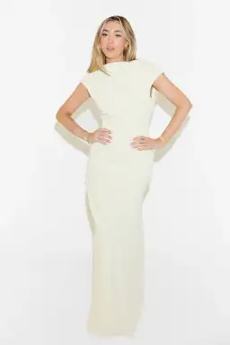 If elegance was a dress, she would be it muses. Back for our bridesmaid collection in two new colourways. Adorned with delicately draped shoulders that lead into an open low cut back and creates a sophisticated high cowl neckline to complete this flattering party favourite, where simplicity creates opulence.