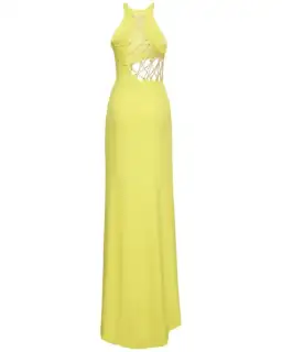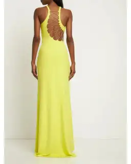 Self: 95% viscose, 5% elastane Lining: 100% viscose. Made in Slovenia. Dry clean only. Fully lined. Hidden side zipper closure. Gold-tone chain detail at front and back. Slinky jersey fabric with side seam slit and train.
