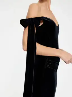 Off shoulder neckline with delicate velvet bow straps on both sides of the body, made from our luxurious velvet fabrication. A statement gown for your next special event.