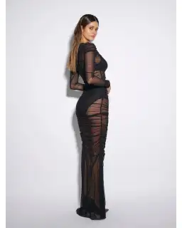 The Rhodes Maxi Dress is made from ruched black mesh that's super stretchy and is perfect for layering over black high waisted panties and a triangle cut bralette. It's cut for a close, figure-hugging fit. Wear it with a pair of barely there heels.