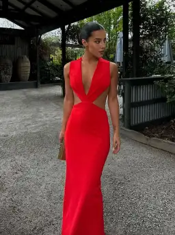 Valencia Gown is defined by the sharp V neckline and cutouts at the waist. Perfect for glamorous evening events, it's made from stretch scuba crepe that has a back split.