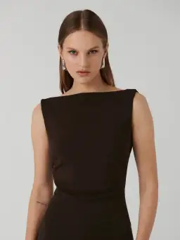 Our 'Verona' gown is so evocative of '90s glamour. Made from luxurious stretch-crepe, it has the decade's defining high neckline and simplistic silhouette. Complement the gown with a statement earring and hand held clutch.