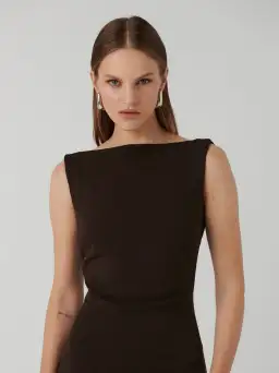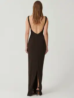 Our 'Verona' gown is so evocative of '90s glamour. Made from luxurious stretch-crepe, it has the decade's defining high neckline and simplistic silhouette. Complement the gown with a statement earring and hand held clutch.
