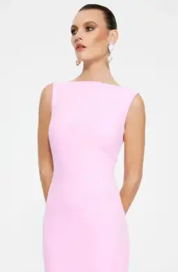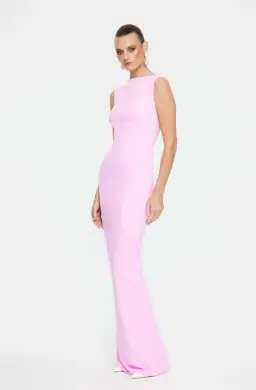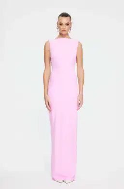 Effie Kat's'Verona' gown is so evocative of '90s glamour. Made from luxurious stretch-crepe, it has the decade's defining high neckline and simplistic silhouette. Complement the gown with a statement earring and hand-held clutch.
