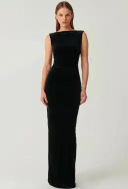 Featuring a beautiful high straight neckline that falls into a low back and cut with a slight split at the back. Crafted from our luxurious stretch velvet that hugs the figure for the most beautiful cinched silhouette. Super flattering