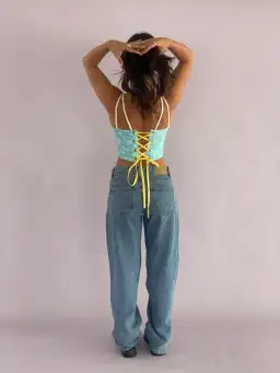 Made from our signature logo print linen. The corset is fully lined with an adjustable tie back, lace straps and gold detailing. Details: Made from linen. Lined with natural cotton. Boning throughout Twin lace straps. Gold detailing. Tie up back.