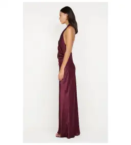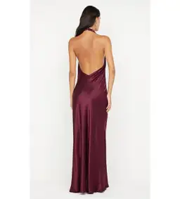 The BEC + BRIDGE Elisia Maxi Dress in Plum is a stunning maxi dress crafted from georgette fabric. Featuring a halter neckline with an elasticated neck band, the wrap style ties at the low waist, creating a flattering silhouette. The dress has a V neckline, a low back, and is fully lined for comfort and elegance. Finished with a narrow rolled hem, it's perfect to pair with BEC + BRIDGE Kate Heel for evening events or formal occasions.