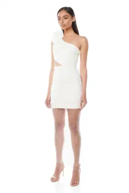 The silhouette is cinched at the waist and features a cut out detail with a peak of skin through delicate diamanté studded mesh.