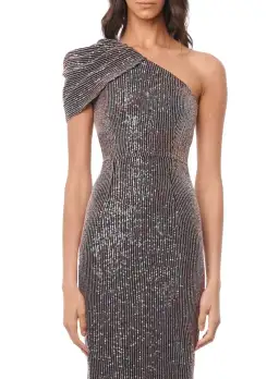 The Allegra Gown designed in sequin features a one shoulder neckline with a draped sleeve detail.