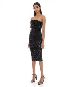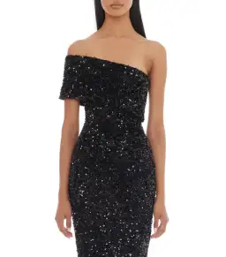 The Alyssa Dress is designed in a richly embellished black sequin and features a flattering bodycon silhouette and asymmetrical one shoulder neckline. Complete with lining and a centre back exposed metal zipper, the Alyssa Dress is the essence of elegance and beauty!