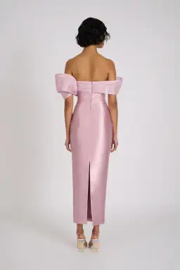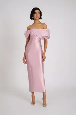 The Annika Dress is fully lined for comfort and finished with a centre-back invisible zipper for a smooth, seamless fit. The dramatic off-the-shoulder sleeves, adorned with micro-pleated structural detailing, add an element of bold, high-fashion flair. These striking sleeves elevate the dress, giving it a unique and couture-inspired touch that is sure to turn heads.