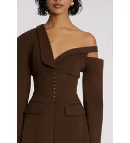The Ayla Blazer Dress is a striking blend of elegance and modern edge, designed to make a statement at any event. Crafted in a sleek chocolate wool-blend, this dress features a bold off-the-shoulder design, exuding sophisticated charm with a contemporary twist.