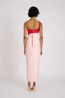 Cartia Dress is a midi-length silhouette featuring lightly padded cups with underwire support and a bonded bodice that cinches the waist, enhancing the silhouette. The draped bodice detail adds elegance, while the contrast of colours creates striking colour blocking. A fold-over waist reveals a vivid red underlay beneath the soft pink exterior, adding dimension and drama. The skirt includes a thigh-high side split for a touch of allure. Fully lined and finished with an invisible centre-back zipper, this dress is perfect for cocktail parties, weddings, and standout events.