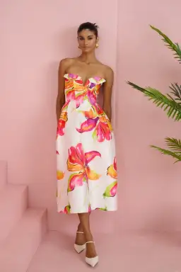 Introducing the Elis Dress, a stunning midi-length strapless dress designed to make a statement. With its elegant full circle skirt, this dress flows beautifully with every movement, creating a romantic and feminine silhouette. The invisible zipper at the centre back ensures a seamless look, while the full lining guarantees comfort and a flattering fit. Perfect for any occasion, from garden parties to evening soirées, the Elis Dress effortlessly combines sophistication with effortless charm, making it a timeless addition to your wardrobe. Embrace elegance and grace with this versatile piece that’s sure to turn heads.