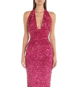 The Emilee Dress is a striking piece that fuses timeless style with contemporary glamour. This midi-length dress shimmers with her burgundy sequin fabrication and her halter neck style silhouette. She is complete with a centre-back metal zipper and a sultry plunge back that will surely leave a lasting impression on your next special occasion.