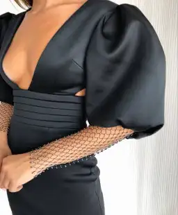 Featuring sculpturally pleated, full sleeves nipping in to reveal striking shimmers of delicate diamanté mesh finishing at the wrist, this stunning slim-fit scuba piece will create a stir at your next event.