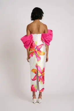 A striking off-the-shoulder silhouette that effortlessly combines bold style with tropical flair. Crafted from their signature watercolour floral print of the season, the Joni Dress showcases a vibrant, eye-catching pattern that captures the essence of sun-soaked adventures.