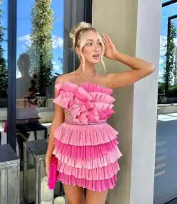 The Josephine Dress is luxuriously layered with finely pleated ruffles which curve around the body. This fitted bandeau mini is the ultimate style for your next event, with a metal zip fastening at the back and fully lined, the bold colour contrasts of pinks create a truly dramatic effect.