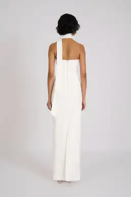 The Kristine Gown embodies effortless elegance and modern romance, making it the perfect choice for a glamorous evening or special occasion. Featuring a chic one-shoulder design, this elegant evening gown is enhanced with a delicate draped tie that gracefully wraps around the neck, providing a flattering and fluid fit. The tie is attached at the side seams, offering both structure and style.