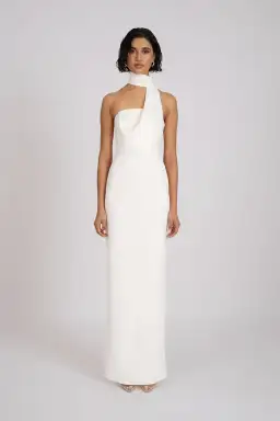 The Kristine Gown embodies effortless elegance and modern romance, making it the perfect choice for a glamorous evening or special occasion. Featuring a chic one-shoulder design, this elegant evening gown is enhanced with a delicate draped tie that gracefully wraps around the neck, providing a flattering and fluid fit. The tie is attached at the side seams, offering both structure and style.